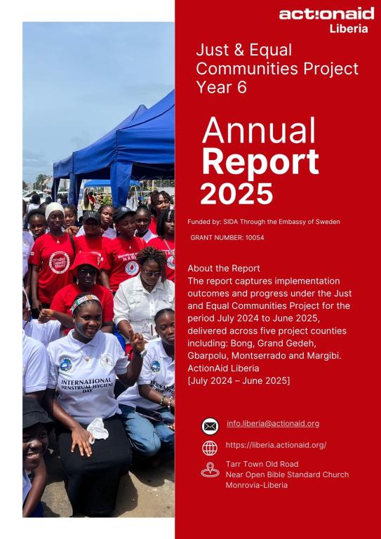 The report captures implementation outcomes and progress under the Just and Equal Communities Project for the period July 2024 to June 2025, delivered across five project counties including: Bong, Grand Gedeh, Gbarpolu, Montserrado and Margibi.